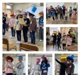 3月22日 月曜日 2年2組が、お昼から図工で作成した帽子を被り、ファッショ...