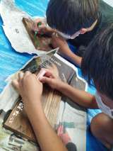 5年生が林間学習の思い出などを焼き板に表現しました。