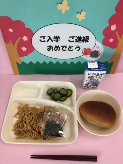 焼きそばは、人気の定番メニューです。豚肉を主材にソース等で味つけします。1人1袋、きざみのりをかけていただきます。