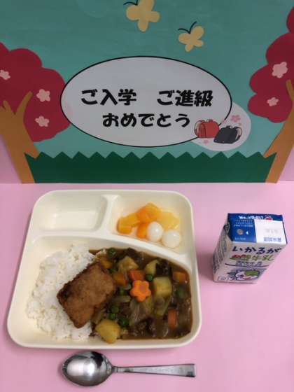 新入生の入学や進級をお祝いする献立です。子どもたちに人気のカレーライスに、一口トンカツを添えて食べます。デザートは、ミックスフルーツの缶詰と、白玉だんごをあわせたフルーツ白玉です。