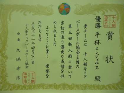 嬉しい報告もありました。昨日行われたキックベースボール大会で、平林エンジェルスが優勝し、みんなの前で表彰を行いました。