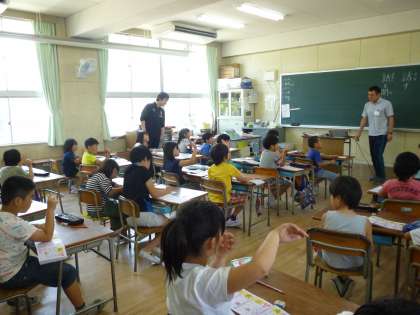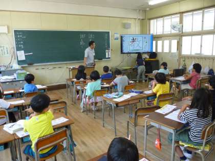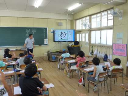 子どもたちも大型テレビを見ながら「1・2・3・・・」と画数を数え、手を動かして漢字を学習しています。