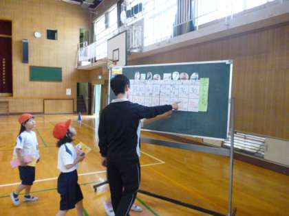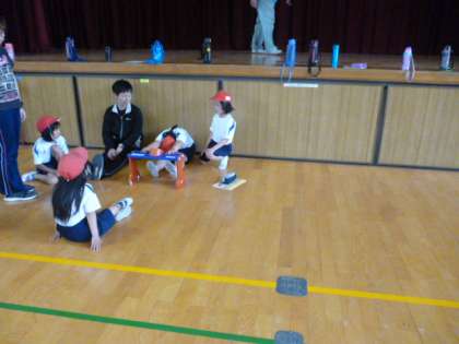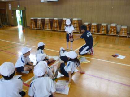 講堂にて体力テストの記録をとりました。