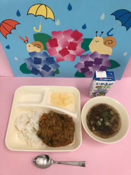 もずくとオクラのとろり汁は、夏野菜のオクラともずくを組み合わせたとろりとした汁ものです。給食のもずくは「オキナワモズク」で、太くて柔らかいのが特徴です。食物繊維がたっぷりで、粘りがあります。