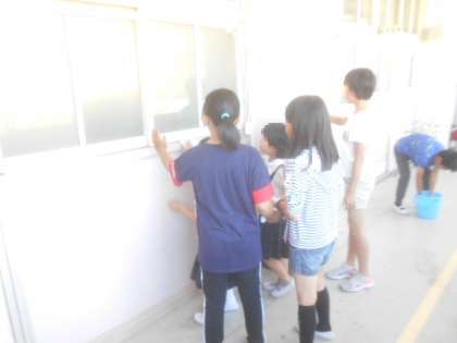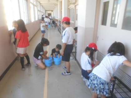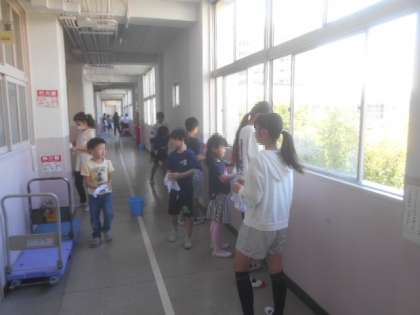 高学年が低学年に雑巾の使い方を教える様子にとてもいい学び合いができていると感じました。