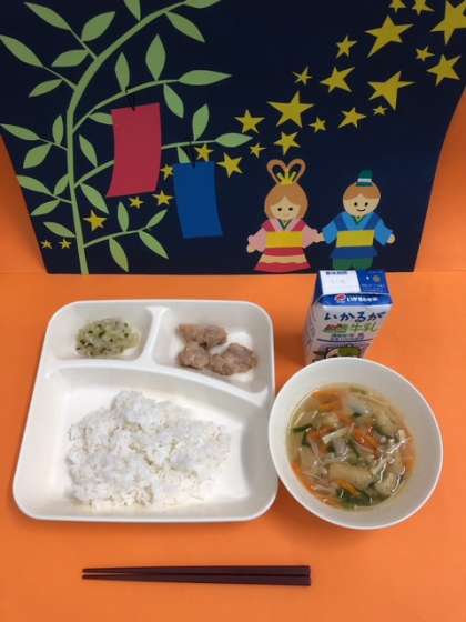 7月は、いろいろな夏野菜が登場する月です。かぼちゃ、なす、オクラ、ピーマン、とうがん、トマト(生)、グリーンアスパラガスなど多くの旬の野菜を使用します。また、年1回7月にだけ使用できる赤ピーマン、にがうりも登場します。