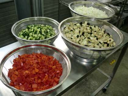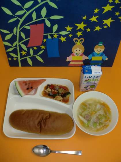 鶏肉と夏野菜のソテーは、年1回、7月のみ使用できる赤ピーマンを使用した彩りのよい炒めものです。赤ピーマンは、緑色のピーマンが赤くなるまで熟してから収穫したものです。日光をたくさん浴びて育つため、緑色のピーマンに比べて、ビタミンCやカロテンが2倍以上含まれています。