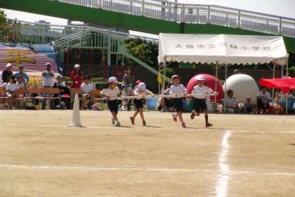 4年生の「台風55号(5ー5ーGO!!)」では、4人のチームワークが大切です。外側になった児童は、大きく回りながら走らなければならないので、少し疲れたかな?