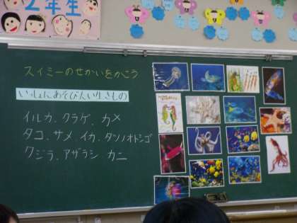 10月8日(水)の5限目に2年生で、伊藤先生による図画工作の研究授業がありました。「スイミーのせかいをかこう」という題材で、2年生の児童はスイミーになったつもりで海の中の世界をパスをもちいて書いています。絵を見ていますと子どもたちの発想力と想像力に感動しました。