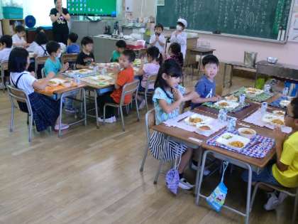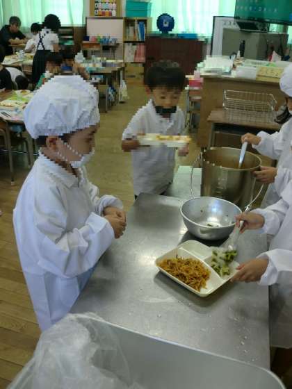 配膳器具を上手に使ってきれいに盛り付けています。感謝を込めていただきます。