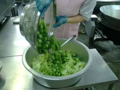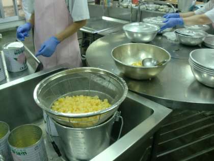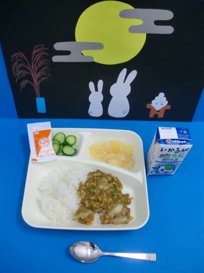 大豆入りキーマカレーライス[米粉]は、牛ひき肉、豚ひき肉の他にひきわり大豆、たまねぎ、にんじん等が入っています。残暑のきびしいこの時季にとても食べやすい献立です。