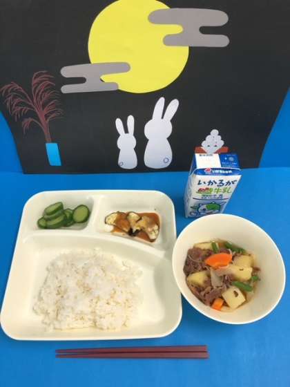 肉じゃがは、牛肉とじゃがいもを使用したご飯がすすむ献立で、子どもたちにも毎回好評です。焼きなすのみそだれかけは、なすを焼き、赤みそ、砂糖、こい口しょうゆで作ったたれをかけます。綿実油をなすにからませて焼くことで、パサつきをおさえています。