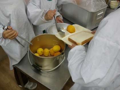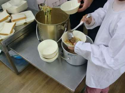 タンタンめんは、白ねぎ、しょうがなどの香味野菜とみそやテンメンジャンなどで味つけした肉みそを、配食時に汁めんの上にのせて食べます。テンメンジャンは、深い赤色と甘みが特徴のみそです。