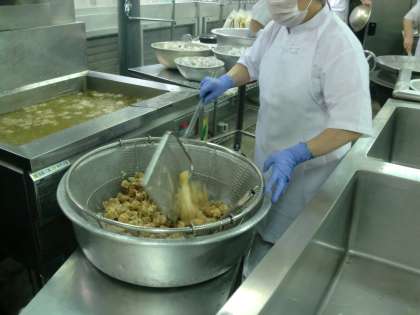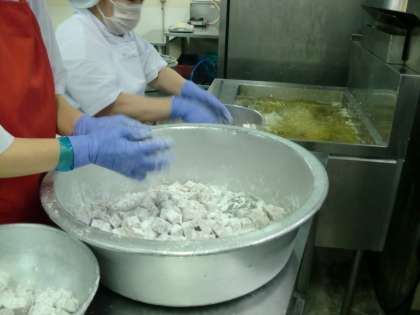 まぐろのオーロラ煮は、しょうが汁で下味をつけたまぐろにでんぷんをまぶして揚げ、ケチャップ、砂糖、赤みそで作ったタレをからませます。魚の臭みがなく人気のある献立の一つです。