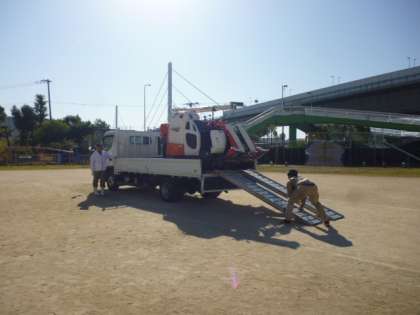 JAの方や建設局南部方面事務所の方の協力もあり、コンバインを学校に運んでいただき、実際の様子も見させていただきました。