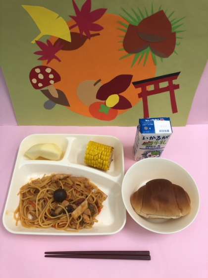 きのこのスパゲッティは、エリンギ、生しいたけ、しめじを使ったスパゲッティです。秋が旬のきのこがたっぷり入った子どもたちに好評な献立です。