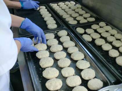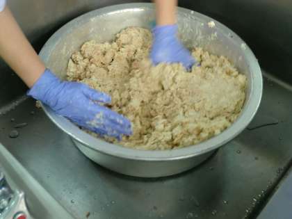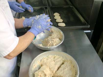 とうふハンバーグは、ツナ、とうふ、荒みじん切りのたまねぎ、調味料等を混ぜ合わせ、1人1コずつにまとめ、焼き物機で焼きます。ケチャップが1人1袋つきます。