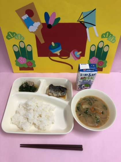 みずなは、京都で古くから栽培されていた京野菜です。くせが少なく食べやすい野菜で、今回は豚肉と合わせて煮びたしにすることで、旨みを出しています。みずなは給食では年に1回、1月に登場します。