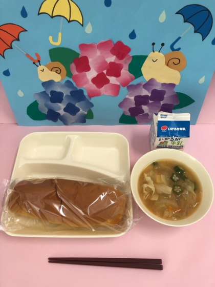 みそ汁は、とうふ、キャベツ、たまねぎ、にんじん、青みにオクラを使用しています。
