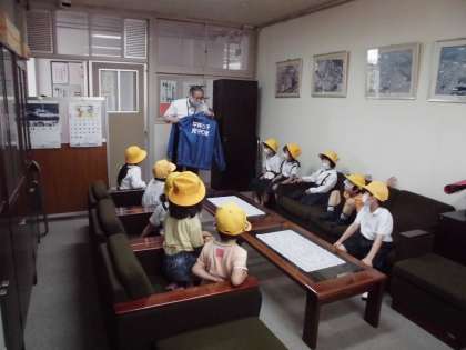 校長室では、校長先生から見守り隊ジャケットを見せてもらい