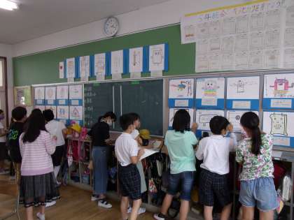 5時間目に図工の学習で仕上げた作品を鑑賞しました。友達の作品を鑑賞して、よかったところや真似したいなと思ったところ、作品の感想を書きました。