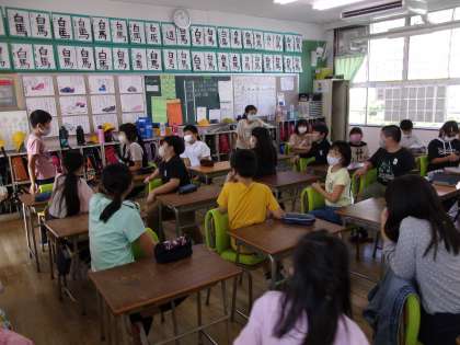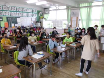 5時間目に学級活動で一人ずつ自己紹介をして、係が考えたゲームで楽しみました。
