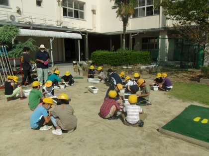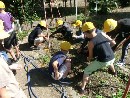 係の人が毎日水をあげてくれているおかげで、小さな芽がでてきました。子どもたちから、「できるのが楽しみ!」などの声が聞こえてきました。