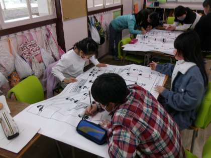 そのあと、一枚の学校のイラストから、けががおきそうな行動に目をつけて、どんな事故やけがが起きるか予想しました。