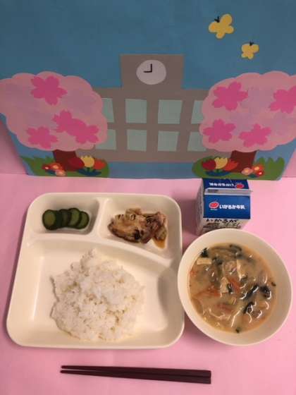みそ汁は、うすあげ、じゃがいも、たまねぎ、キャベツ、にんじん、青みにだいこん葉を使用しています。だしは、にぼしでとります。