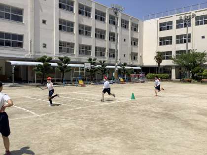 オリンピックの選手のバトン技術を動画を見たあと、実際に運動場でリレーの練習をしました。