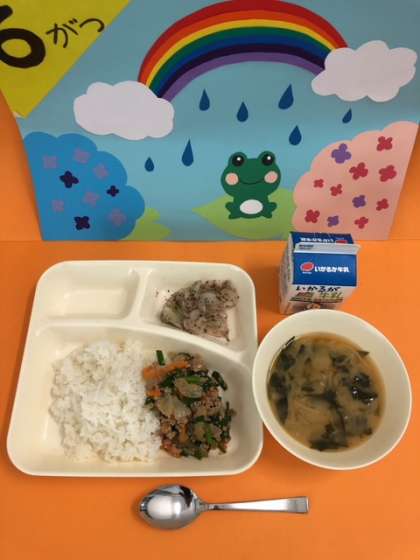 豚ひき肉とにらのそぼろ丼は、令和元年度学校給食献立コンクール最優秀賞に選ばれた献立をもとにしています。好評だったため再登場となります。
