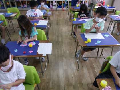 小さくちぎった色画用紙を丸く貼っていき、あじさいを作っています。色合いを考えて、一枚一枚丁寧に貼っています。大きさや形、色など、それぞれに個性が感じられます。完成が楽しみです。
