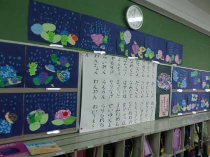 国語科の学習で『あひるの あくび』を学習しました。1年1組のみんなで『あざらし あついよ』という、オリジナルの ことばあそびうたをつくりました。「たこさん たくさん が難しいねん」「まんもす まっちょだ がおもしろいね」と言いながらも、毎日音読することで、すらすら読めるようになってきました。