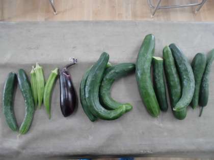 毎日水をやり、草むしりをしてなすび、きゅうり、オクラ、枝豆が育ち収穫しました。