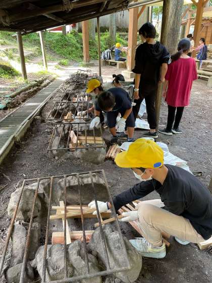 野外炊飯 1 かまど係が一生懸命、火の準備をしています。