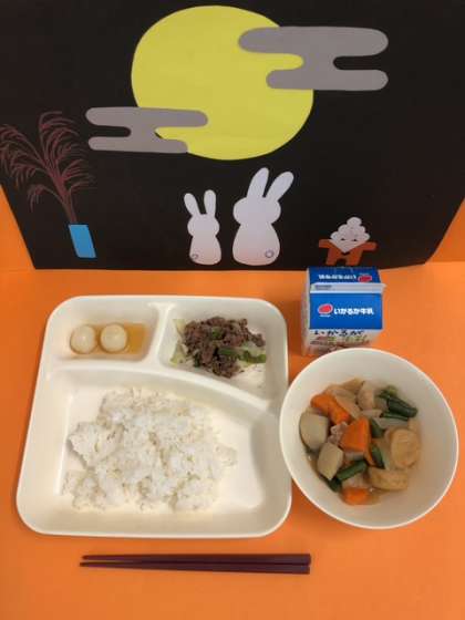 月見の行事献立です。一口がんもとさといものみそ煮は、十五夜が「芋名月」と言われることや、十五夜にさといもを供える習慣があることから、さといもを使用した煮ものとなっています。今年は9月21日が十五夜です。