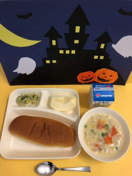 コーンクリームシチュー[米粉]は、小麦粉を使った手作りルウの代わりに水どきの上新粉でとろみをつけます。スイートコーン(クリーム缶)、コーンの他に、にんじん、グリーンピースなどを使用し、彩りよく仕上げています。