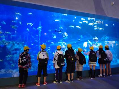 活動班ごとに分かれて、きれいな魚たちが泳ぐ水槽を見て回ります。