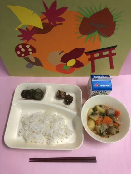 豚肉とじゃがいもの煮ものは、豚肉、じゃがいも、つなこんにゃく、たまねぎ、にんじん、青みにさんどまめが入った煮ものです。