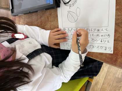 校庭で拾った葉っぱを使って遊びました。できた作品はタブレット端末で撮影しました。上手に写るようにタブレット端末の位置を工夫して撮影しました。その後、記録カードをかきました。自分で文を考え、書けるようになってきました。