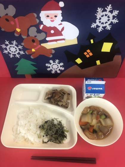 今日の献立は、令和2年度学校給食献立コンクール最優秀賞に選ばれた献立です。献立のねらいは、寒い季節を元気に過ごすために、食欲がわくメニューを考えました。ちりめんじゃことだいこん葉でごはんを食べやすくし、にんにくと白みそで豚肉を風味よく焼きます。これに、旬の冬野菜を使い、でんぷんでとろみをつけた体が温まる煮ものを組み合わせています。