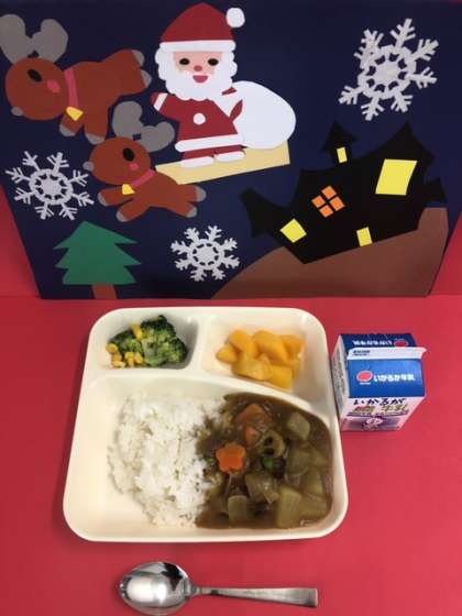 冬野菜のカレーライスは、子どもたちに人気のカレーライスに、冬が旬のだいこん、れんこんなどを使用しています。給食室で花形に切り抜いたラッキーにんじんが入っています。