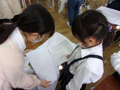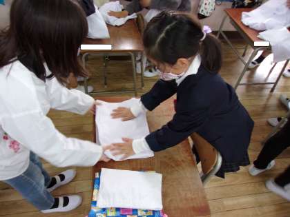 今日は1年生にとって初めての給食なので、6年生がエプロンの着方やたたみ方を教えに行きました。一人ひとり丁寧に教えることができました。これからも最上級生として、いろいろな場面で下級生のお手伝いをしていきたいと思います。