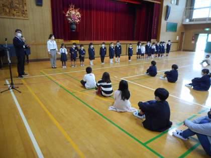 2〜6年生が講堂で待つ中、1年生が入場し、対面式が始まりました。