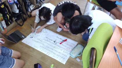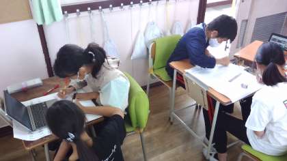 グループに分かれて、防災ポスターを作っています。伝えたいことは何か、より伝わりやすくするにはどのような構成で書けばよいかなどを考えながら下調べをし、模造紙に書いています。自分たちが伝えたいことが一番伝わる資料を選んだり、強調したいところを色を変えたりして工夫しました。完成したポスターは、土曜授業の引き取り訓練のときに講堂に掲示する予定です。