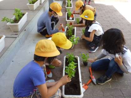今日は、3年生の子どもたちが一つ一つの苗を丁寧にプランターに植え替えをしていました。元気に育った花の苗に、子どもたちは大喜びでした。