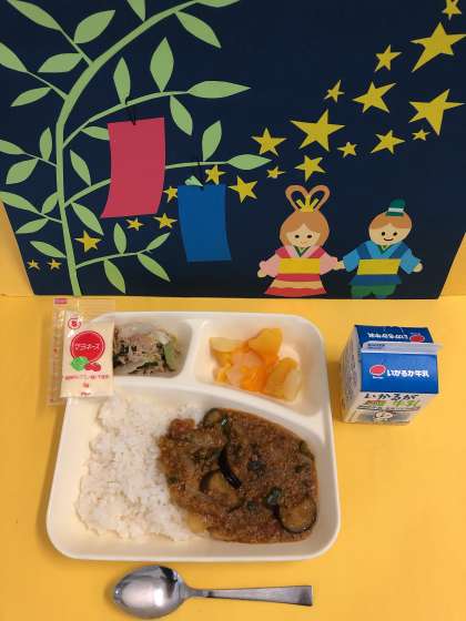 今日の給食は、令和3年度学校給食献立コンクール優秀賞に選ばれた献立です。児童が考えた献立のねらいは、「夏野菜をたくさん食べることで、夏バテ予防になると思い、考えました。」です。