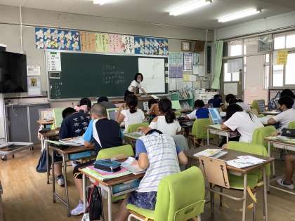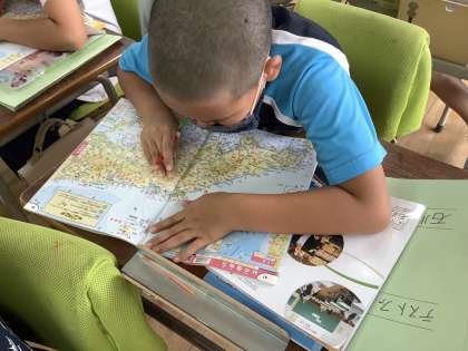 社会科の学習の最初に、地図帳を使って地名探しゲームをしています。