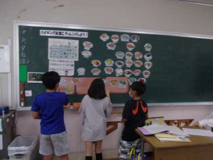 「バイキング給食」がある都道府県があるそうで、ワークシート上で体験してみました。これまで学んできたことを活かして、好きなものばかりを選ぶのではなく、赤、黄、緑のバランスを考えて選ぶことができました。また、一回の食事の中で、主食、主菜、副菜のバランスを考えて献立を立てることも大切だと教えていただきました。