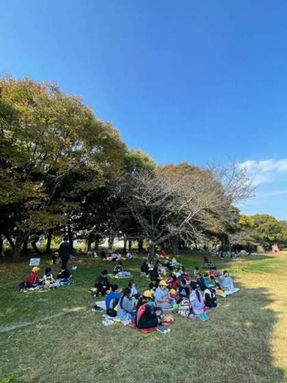 児童は、わんぱく広場でおいしくお弁当を食べました。
